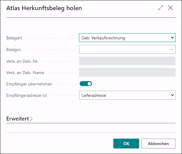 Als Vorgabe wird die „Lieferadresse" aus dem Herkunftsbeleg als Empfängeradresse verwendet. Drücken Sie „OK". Die Daten aus dem Herkunftsbeleg werden in den Ausfuhrauftrag übertragen.