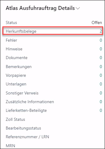Im rot markierten Feld „Herkunftsbelege" können Sie die Anzahl der in diesem Ausfuhrauftrag zusammengefassten Herkunftsbelege sehen.