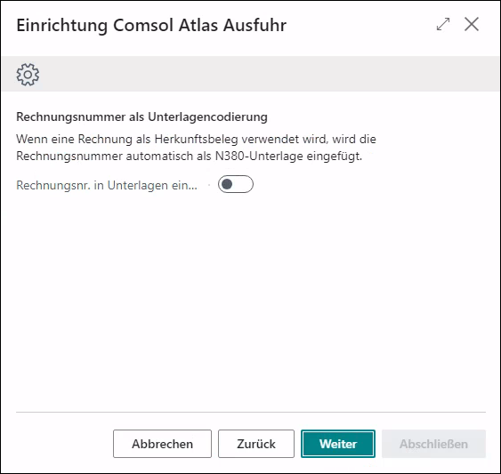| Rechnunungnr. in Unterlagen eintragen | Mit diesem Schalter kann das automatische Eintragen der Rechnungsnummer und des Belegdatums der Rechnung in die Unterlagen (Warenzeile oder Kopf) aktiviert werden. Der Eintrag erfolgt mit dem Typ-Code „N380“ für „Handelsrechnung“. Werden mehrere Herkunftsbelege in einer Ausfuhr zusammengefasst, wird für jeden Herkunftsbeleg vom Typ „Gebuchte Verkaufsrechnung“ eine neue Zeile in die Unterlagen eingetragen. Diese Funktion ist nur für Herkunftsbelege der Art „Gebuchte Verkaufsrechnung“ aktiv. Zudem kann bestimmt werden, ob die Angabe auf Kopf- oder Positionsebene erfolgt. |