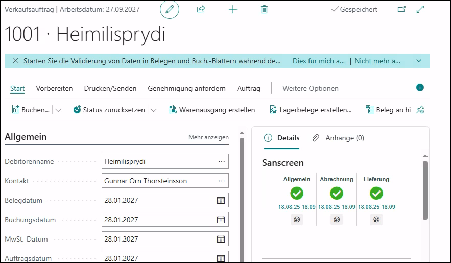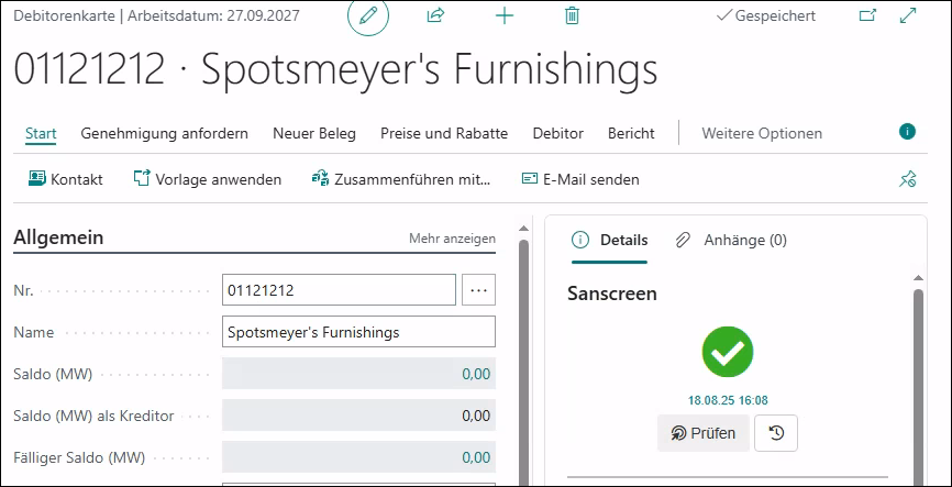 Es besteht die Möglichkeit die Sanscreen Infobox an verschiedenen Stellen einzublenden, um an den Stammdaten oder Belegen eine Prüfung anzustoßen.