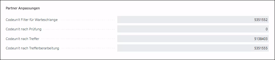 Codeunit nach Trefferbearbeitung | In diesem Feld kann eine beliebige Codeunit angegeben werden, die nach derTrefferbearbeitung ausgeführt wird. Als Argument muss in der Codeunit die Tabelle 5138401 „Sanscreen Posten" deklariert werden. Wird das Feld leergelassen, wird keine Aktion nach einer Prüfung ausgeführt. |