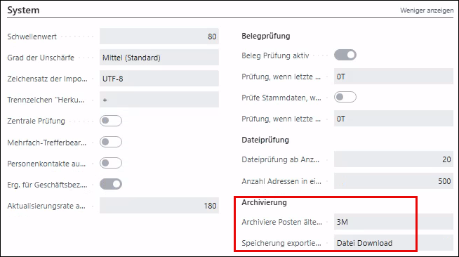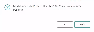 In der Sanscreen Einrichtung kann man über das Feld „Archiviere Posten älter als“ per Datumsformel festlegen, bis zu welchem „Geprüft-Zeitpunkt“ Posten archiviert werden sollen. Die Archivierung kann entweder manuell über die Posten-Seite gestartet oder automatisiert über einen Job (5351560 - CESS Archive Functions) in der Aufgabenwarteschlange ausgeführt werden.