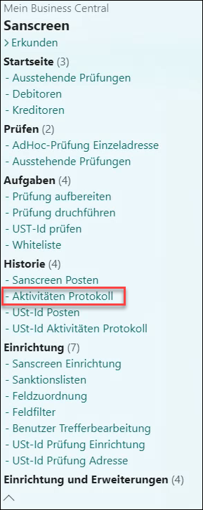 Im Aktivitäten Protokoll werden alle Reports und Codeunits dokumentiert, die von dem entsprechenden Benutzer ausgelöst wurden. Außerdem wird protokolliert, wenn Sanktionslisten aktiviert bzw. deaktiviert werden.