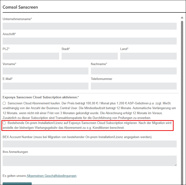 Achtung: Falls Sie bereits Sanscreen nutzen und es sich um eine Migration handelt, dann wählen Sie bitte den Punkt "Bestehende On-prem Installation/Lizenz" aus.
